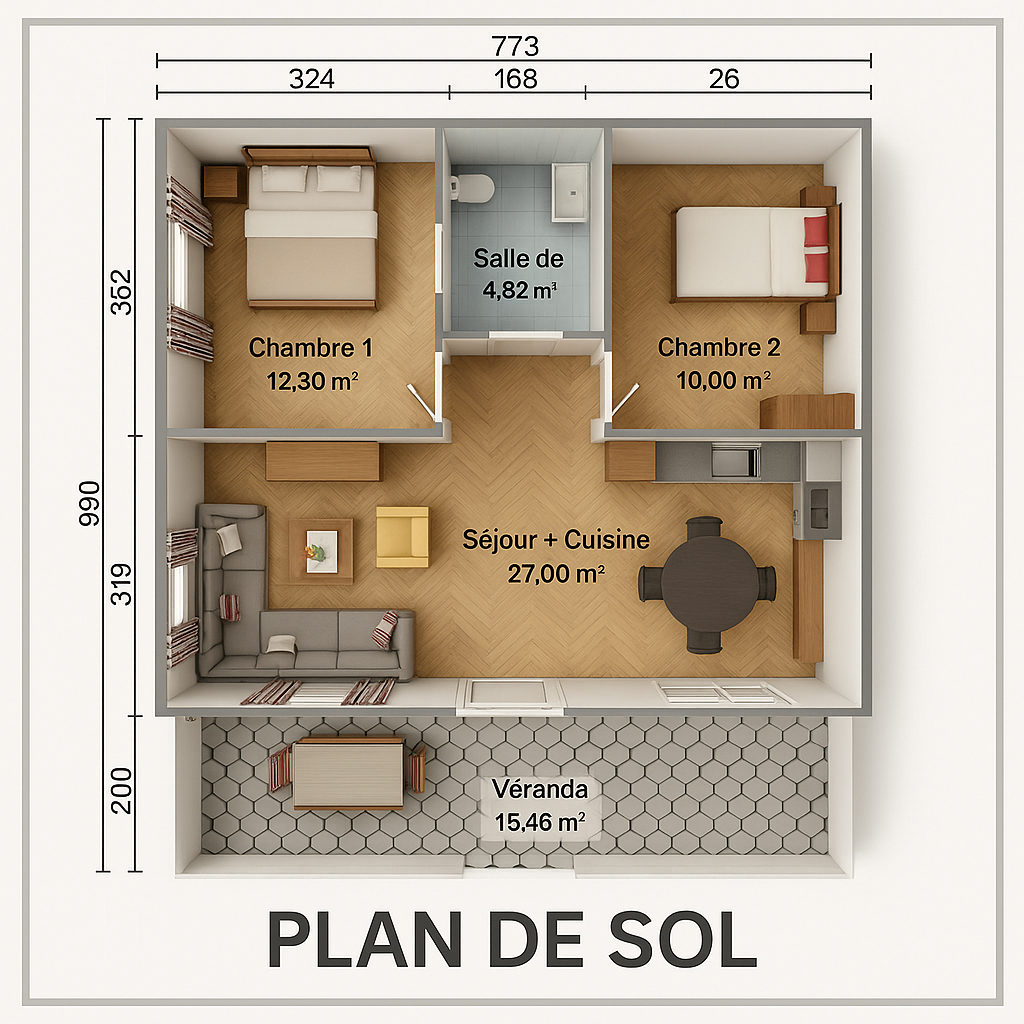 Kompaktna i vrlo funkcionalna prizemna kuća, idealna kao porodična kuća ili vikendica. Dnevni boravak veći od 20 m², velika veranda od 19 m², spavaća soba sa garderoberom i kupatilom. Čelična konstrukcija laka i trajna, spremna za dodatnu termoizolaciju na licu mjesta, prema lokalnim standardima.